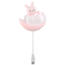 产品名称:USB夜灯(粉色 - 云朵小兔) 产品规格: 11.2x12.8x24cm 外箱尺寸: 46x44x42 cm 产品包装: 彩盒 装箱数量: 72 PCS 材 质: 塑料 颜 色: 粉色;蓝色;薄荷绿;白色 供电方式:可充电