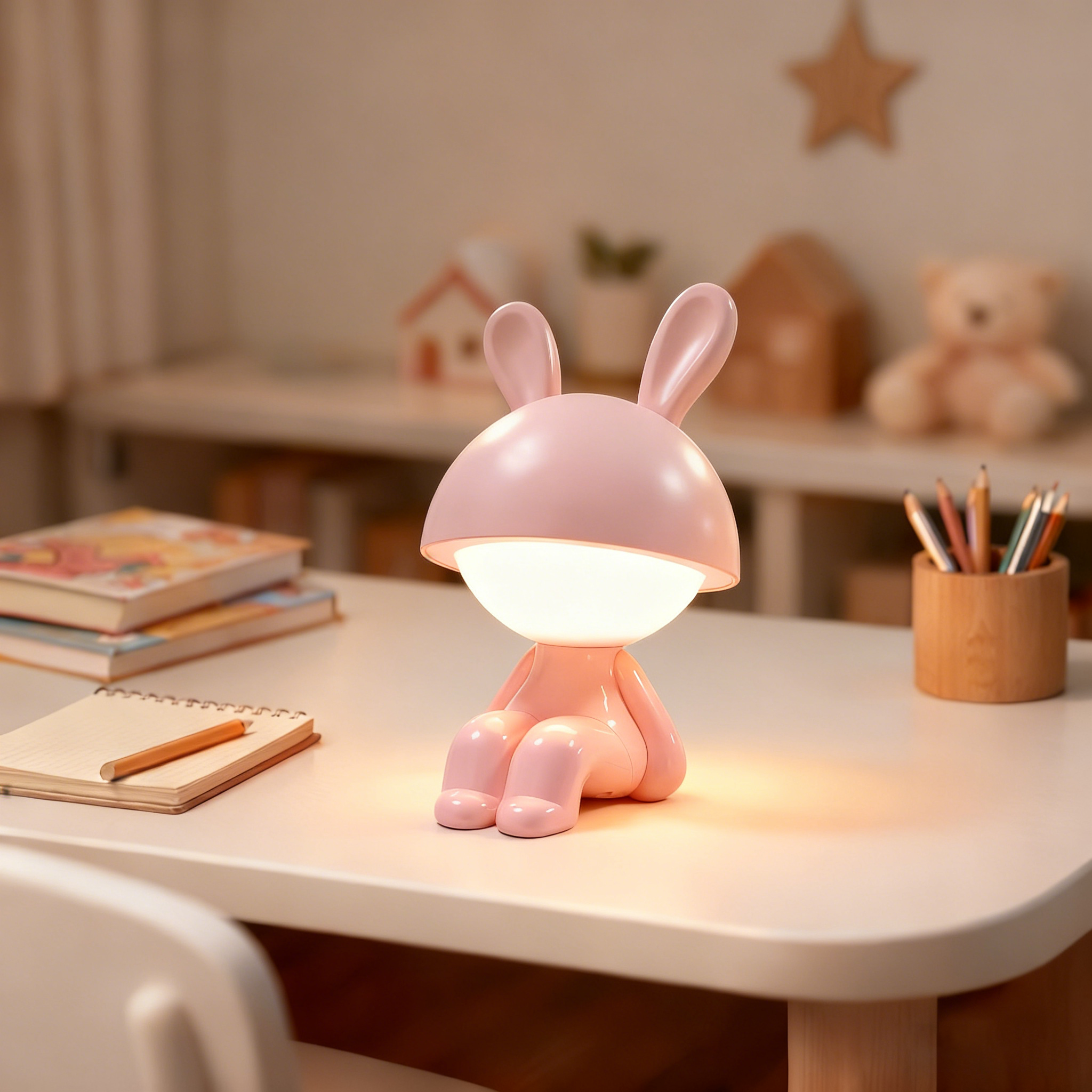 儿童安全认证:采用耐用安全的ABS塑料材质,这款通过CE与RoHS认证的兔子造型夜灯提供无频闪、护眼的柔光照明,为孩子玩耍或睡眠营造安全环境,守护幼嫩双眼。